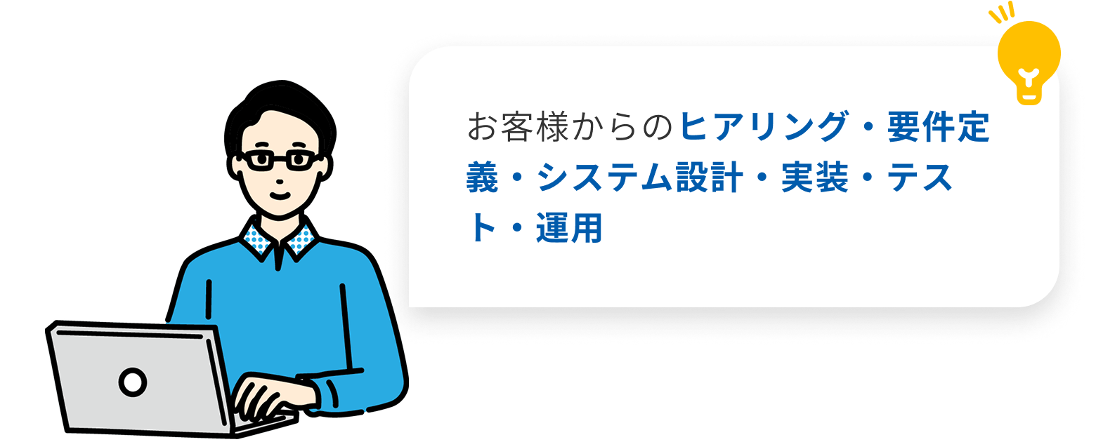 要件定義から設計・開発、運用・保守に至るまでワンストップでサポートし、スピード感と柔軟性を兼ね備えた技術力で、唯一無二のソリューションを実現します。