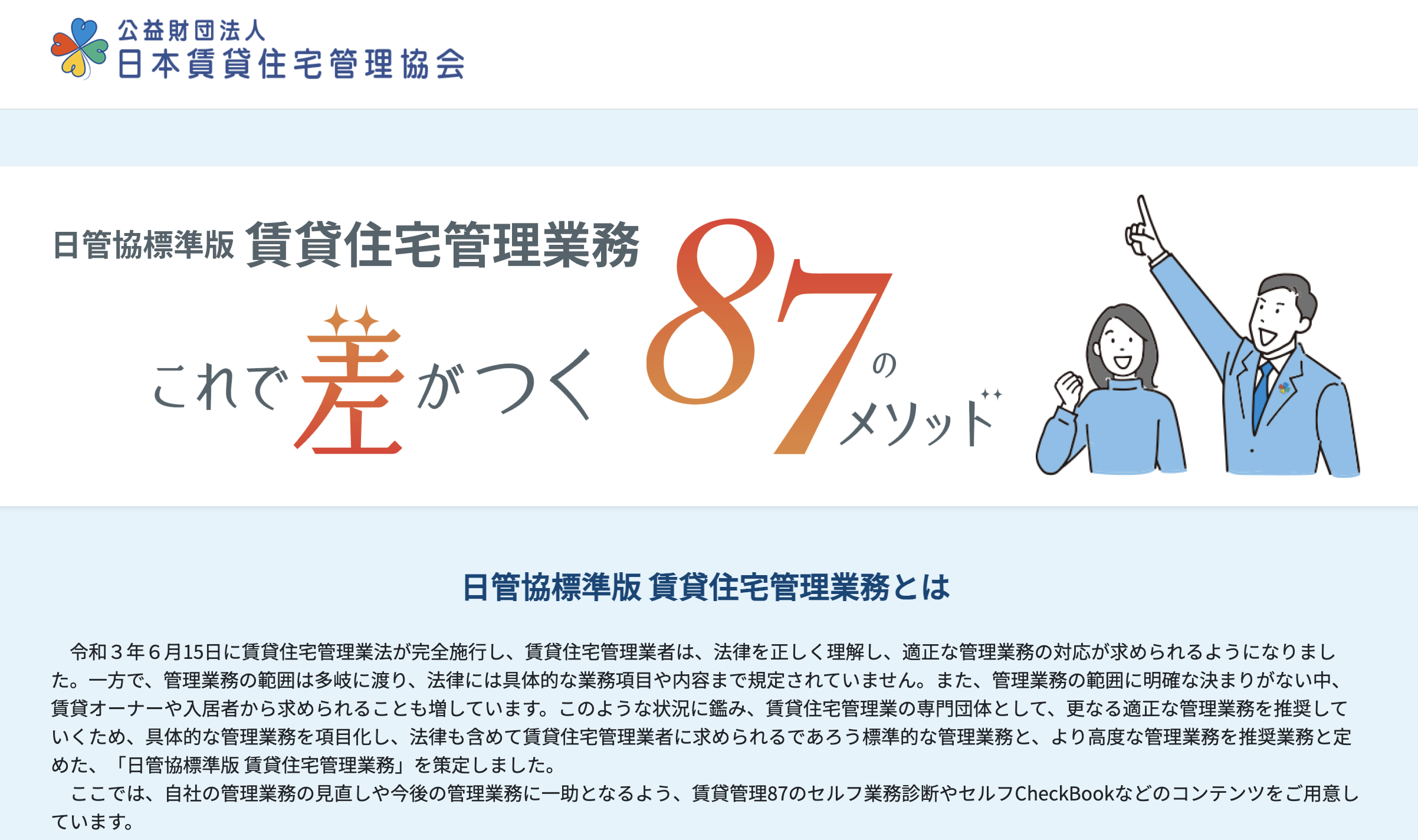 2020年6月に賃貸住宅管理業法ができて、法律で定められた業務は14項目ほどあります。これをベースに、当協会では「賃貸住宅管理業務 87のメソッド」というものを作成しました。これは、管理会社が行う業務を法律で定められている業務以外に、日管協が定める標準的な業務内容と、推奨する業務に細分化した87項目のチェックリストです。