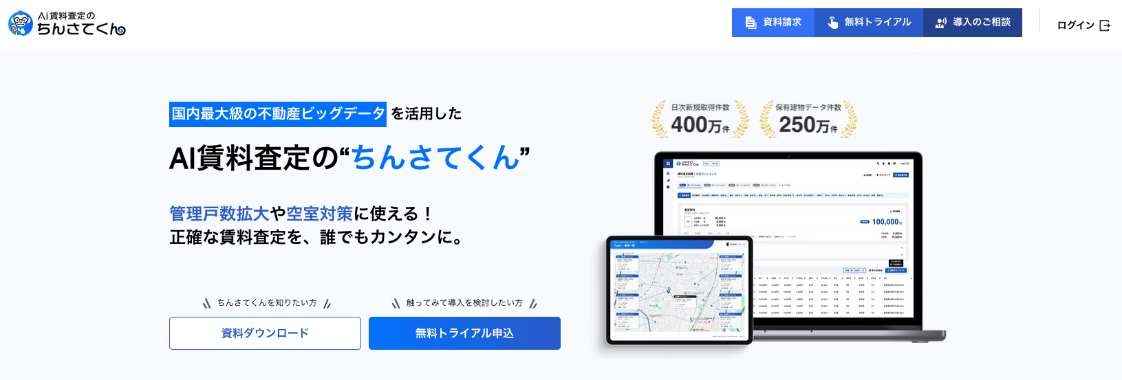 「ちんさてくん」は2025年3月にリリースした、今一番力を入れているサービスで、我々が扱っている膨大な物件データを活用した、革新的な賃料査定ツールです。