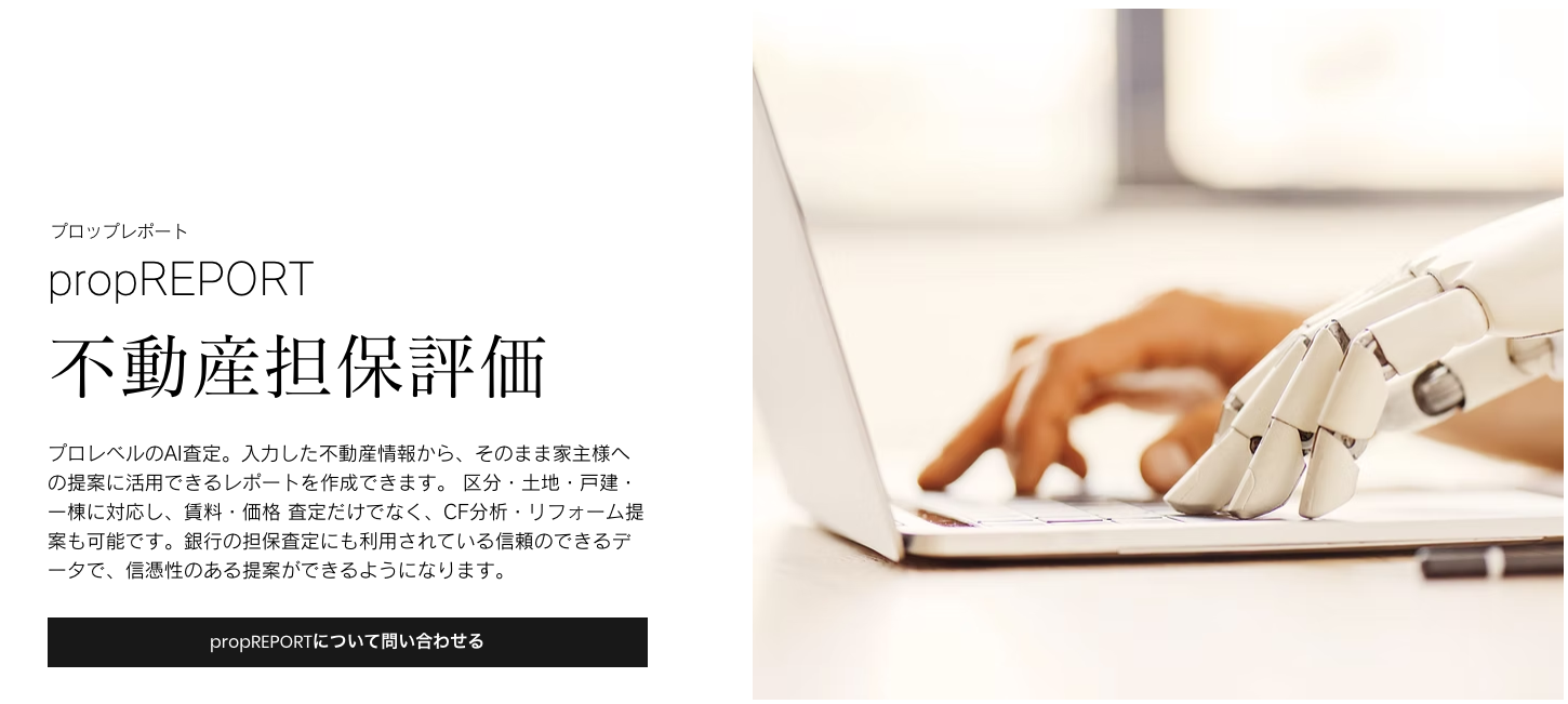 金融機関向けには、主に担保の査定ツール「propREPORT(プロップレポート)」を提供しています。このツールは、融資部や営業支店の方々が、ブラウザ上で簡単に不動産の評価を約1、2分で行えるサービスです。