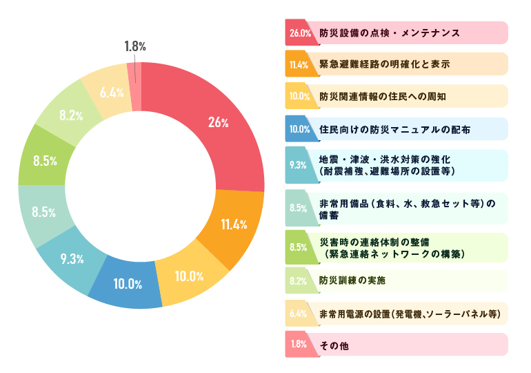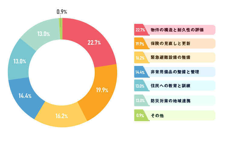 入居者への情報提供が上位となった理由として、災害時の適切な行動には日頃からの防災意識が欠かせないとの認識が広がっていることが考えられます。