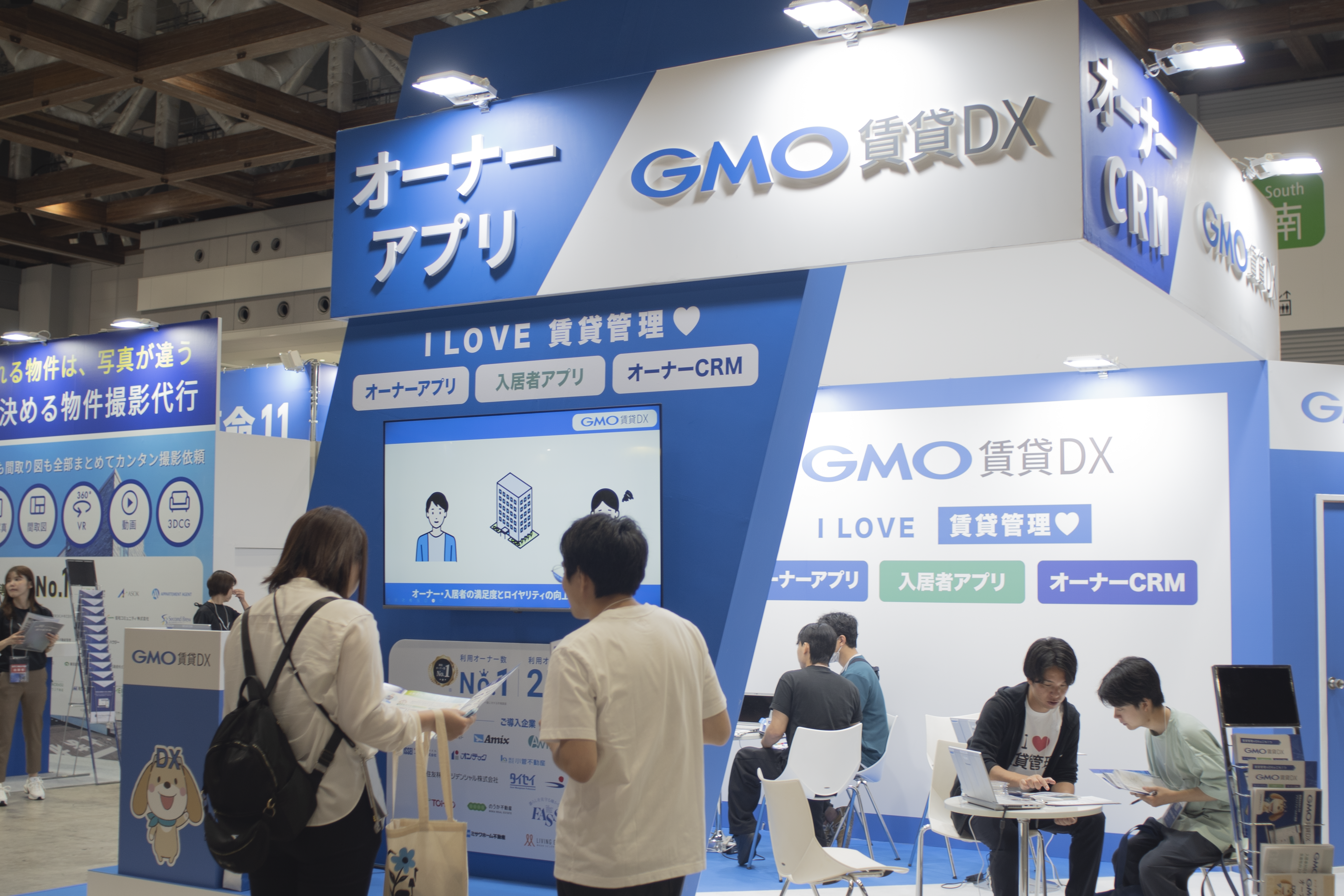 GMO ReTechのブースでは、不動産賃貸管理領域のDXを推進する「GMO賃貸DX」の3サービス『GMO賃貸DX オーナーアプリ』『GMO賃貸DX 入居者アプリ』『GMO賃貸DX オーナーCRM』を紹介いたしました。