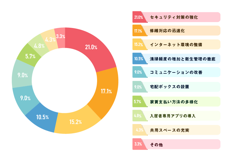 セキュリティ対策が第1位となった背景には、入居者の防犯意識の高まりに加え、単身女性や高齢者など、セキュリティ対策を重視する入居者層の増加があると考えられます。