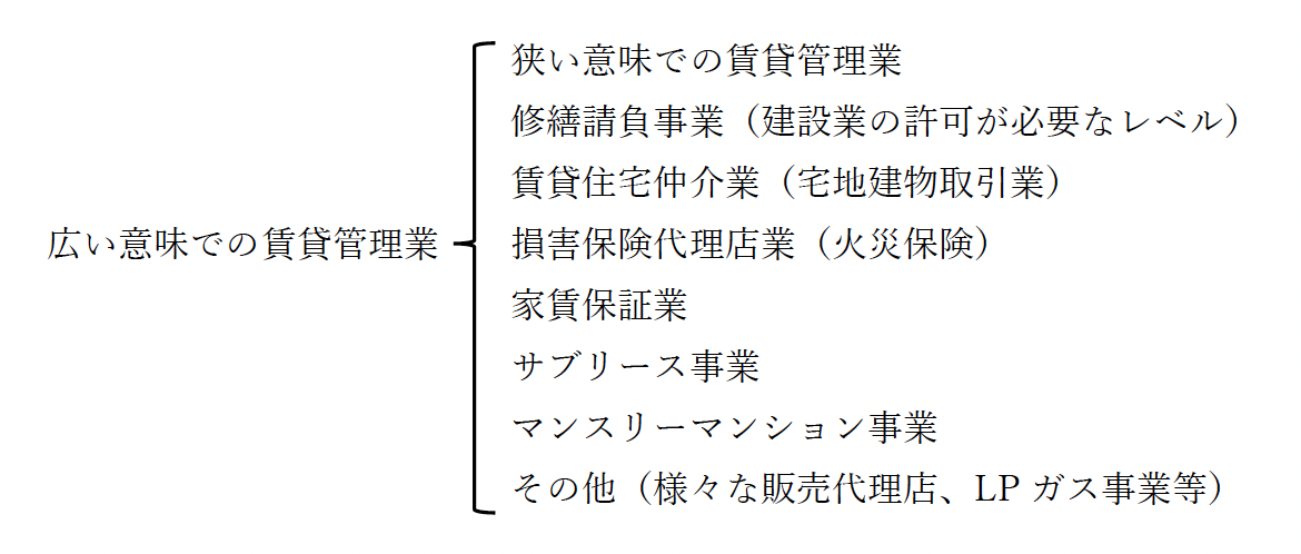 従って広い意味での賃貸管理業と狭い意味での賃貸管理業との関係性は以下の通りとなります。