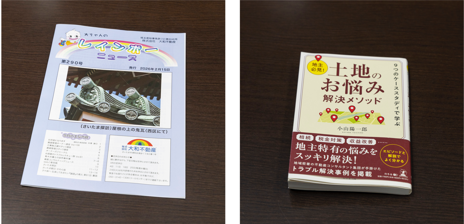 ▲オーナー様向け広報誌「レインボーニュース」と著書の『地主必見! 9つのケーススタディで学ぶ 土地のお悩み解決メソッド』