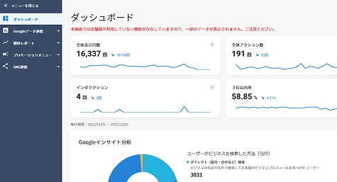 - MEO Dashboard byGMOの管理画面で、各店舗の検索順位・閲覧数・電話数などをリアルタイムで可視化。