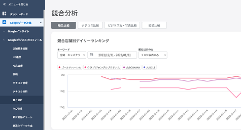 一括管理で運用負担削減 - 独自開発したMEO順位計測ツール「MEO Dashboard byGMO」を用いて、複数店舗(支店・営業所)の日々のキーワード別順位やGoogleインサイト情報の閲覧が可能。Googleビジネスプロフィール(旧Googleマイビジネス)API連携によりビジネス基本情報の更新、写真管理、クチコミ管理もこのツールで一括管理が可能となります。