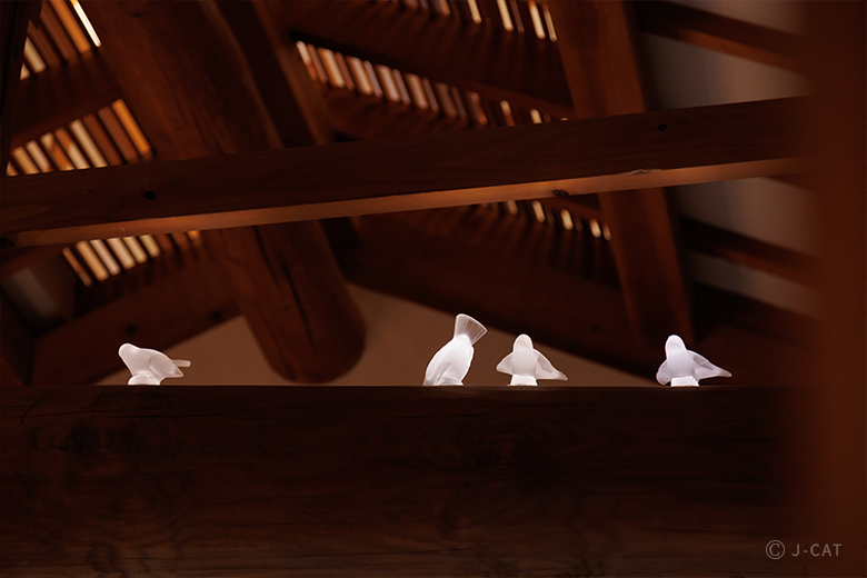 ▲豪華なだけでない、螺旋階段の周囲の仕掛けも楽しんでふと見上げると、柱の上にラリックの鳥がとまっていることに気づきます。ラリックは、アール・ヌーヴォー、アール・デコ期にジュエリー作家やガラス工芸家として活躍したルネ・ラリックが創設したフランスのハンドメイドクリスタルブランド。花や樹木、昆虫、動物、女性像などを題材にしたレリーフによる装飾表現が特徴としています。「鳥籠から解き放たれた鳥」というストーリーにオーナーの遊び心が感じられます。