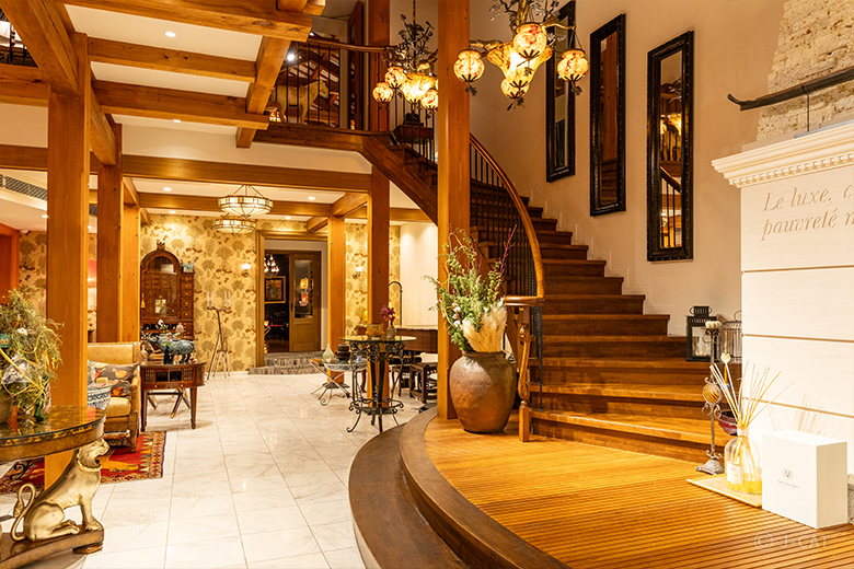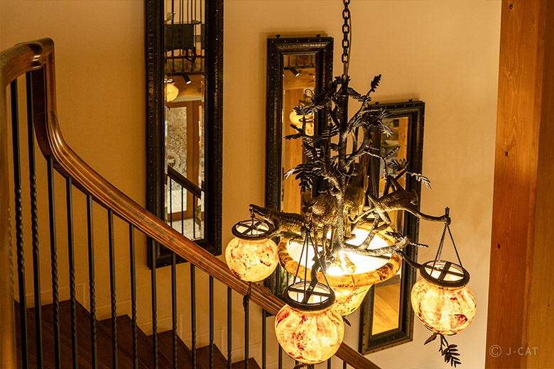 2階へ向かう途中にも楽しい仕掛けが散りばめられています。重厚な螺旋階段の中腹にはアンティークの鳥籠が置かれ、上空には華麗なデザインのシャンデリア。階段を上って見下ろせば、シャンデリアの上に動物をかたどった精緻な彫刻が見られます。