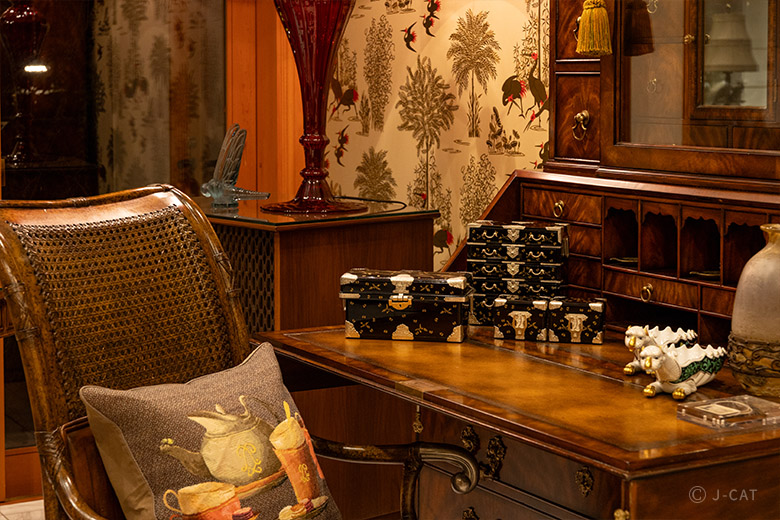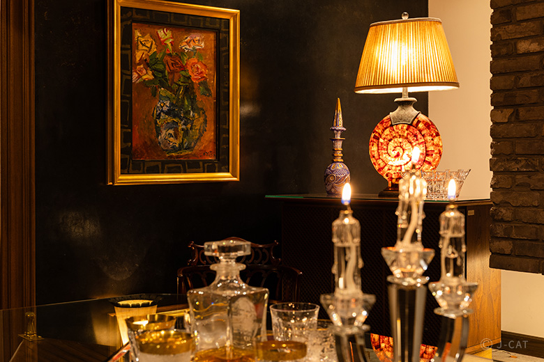 ▲コレクションを配置する角度や取り合わせにもこだわっているそう邸宅の名の由来は、日本国(本州)の美称「秋津洲」から。「あきつ」はトンボの古い呼び名であり、神武天皇が国土を一望してトンボのような形だと称したという日本神話に由来しています。前にしか進まない縁起の良いトンボにあやかり、“一流品に触れることで日本を代表する人材に育ってほしい”というオーナーの想いが込められているそうです。