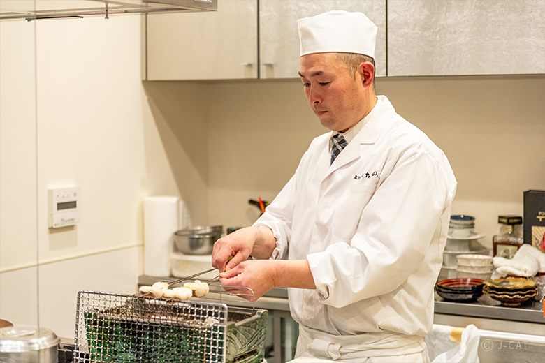 当日は、ライブキッチン付きの部屋を貸切で利用します。食材の香りや調理をする音など、料理が仕上がる瞬間を間近で楽しめるのが魅力。竹田氏との会話も弾む、贅沢なプライベート割烹を満喫できます。
