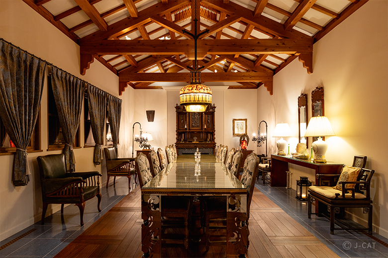 ▲重厚感あふれる会議室AIC秋津洲京都は、AICの創業者がAICのボードメンバーをもてなすために、贅を凝らしてつくった会員制のクラブハウス。 また、AICとは「Academy for International Community」の略称です。オーナーは唯一無二の審美眼を持ち、違いを楽しむことを大切にしながら、絶妙なバランスで各国の歴史や文化を融合させています。