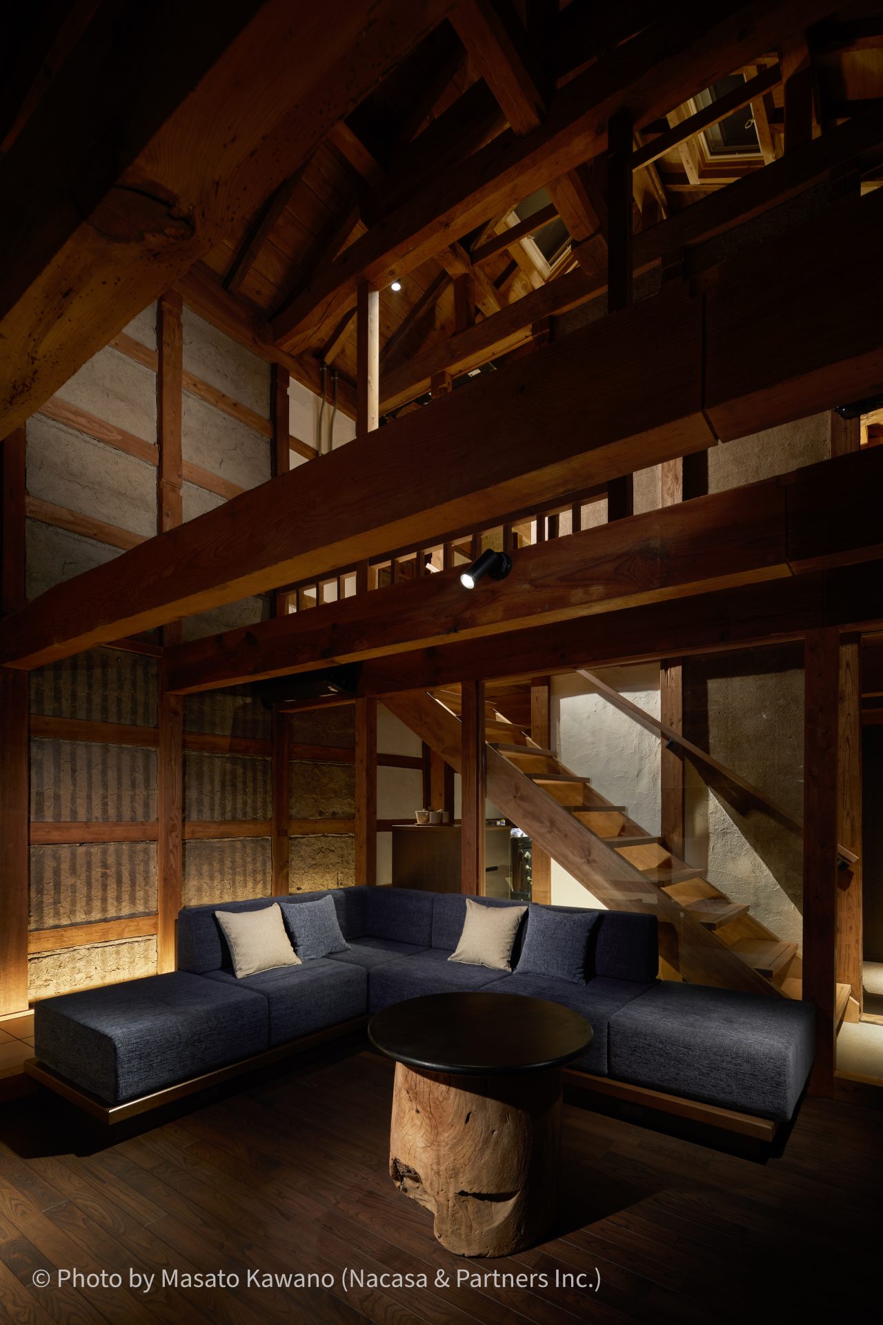 ▲二ノ蔵三ノ蔵は二階建て、土蔵ならではの壁を活かした造り。1階のリビングは梁を残した吹き抜け、2階には100年以上の時を経た伊豆溶岩で秘密基地のような寝室が特徴です。