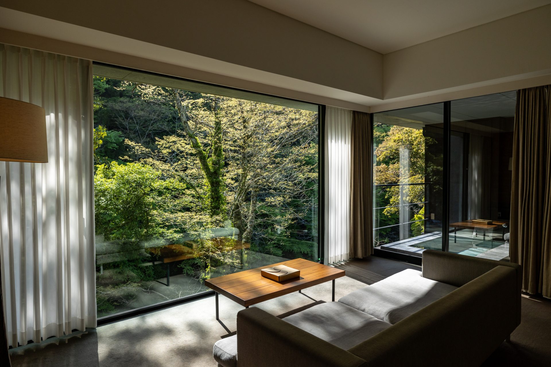 客室はすべて天城の森と狩野川の清流に面し、自家源泉掛け流しの専用露天風呂を備えています。大きなガラス窓から望む緑は絵画のように美しく、室内にいながら自然と一体になれる設計です。テレビは置かれておらず、時間を忘れて源泉に浸かりながら気ままに寛ぐひとときに格別の解放感を得ることができます。