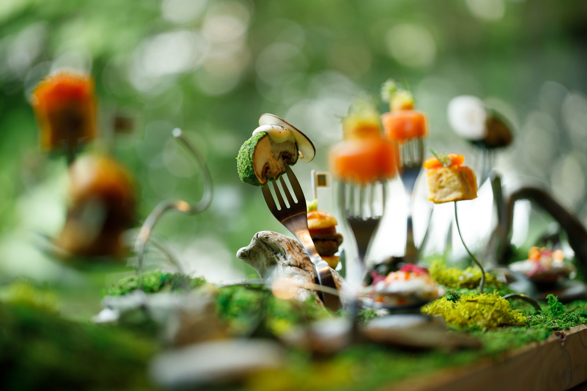 32席のレストランではプライベートを重視した半個室以外の全席が、森を向いており窓外の緑を舞台に繰り広げられるライブキッチンの香りと音で五感を刺激します。朝食には出来立ての卵料理を主役に据えた洋朝食を用意。森の中でピクニックをしているかのような優しい時間が、旅の朝を爽やかに彩ってくれます。
