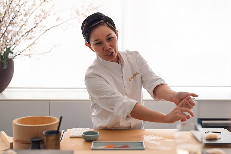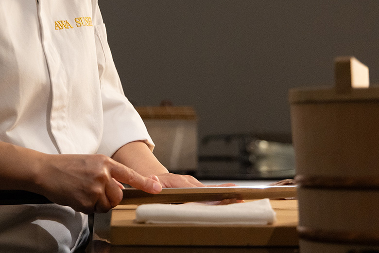 鮨づくりをレクチャーするのは、AWA SUSHI 泡鮨の総料理長・安部愛弓氏。『ミシュランガイド』で4年連続1つ星を獲得するなど世界的な評価も高い、東京の有名鮨店の上海店で料理長を務めました。日本の伝統を守る本格江戸前鮨をベースに、安部氏ならではの繊細かつ大胆な感性を生かした創作鮨で世界を舞台に活躍してきた実力派の女性鮨職人です。