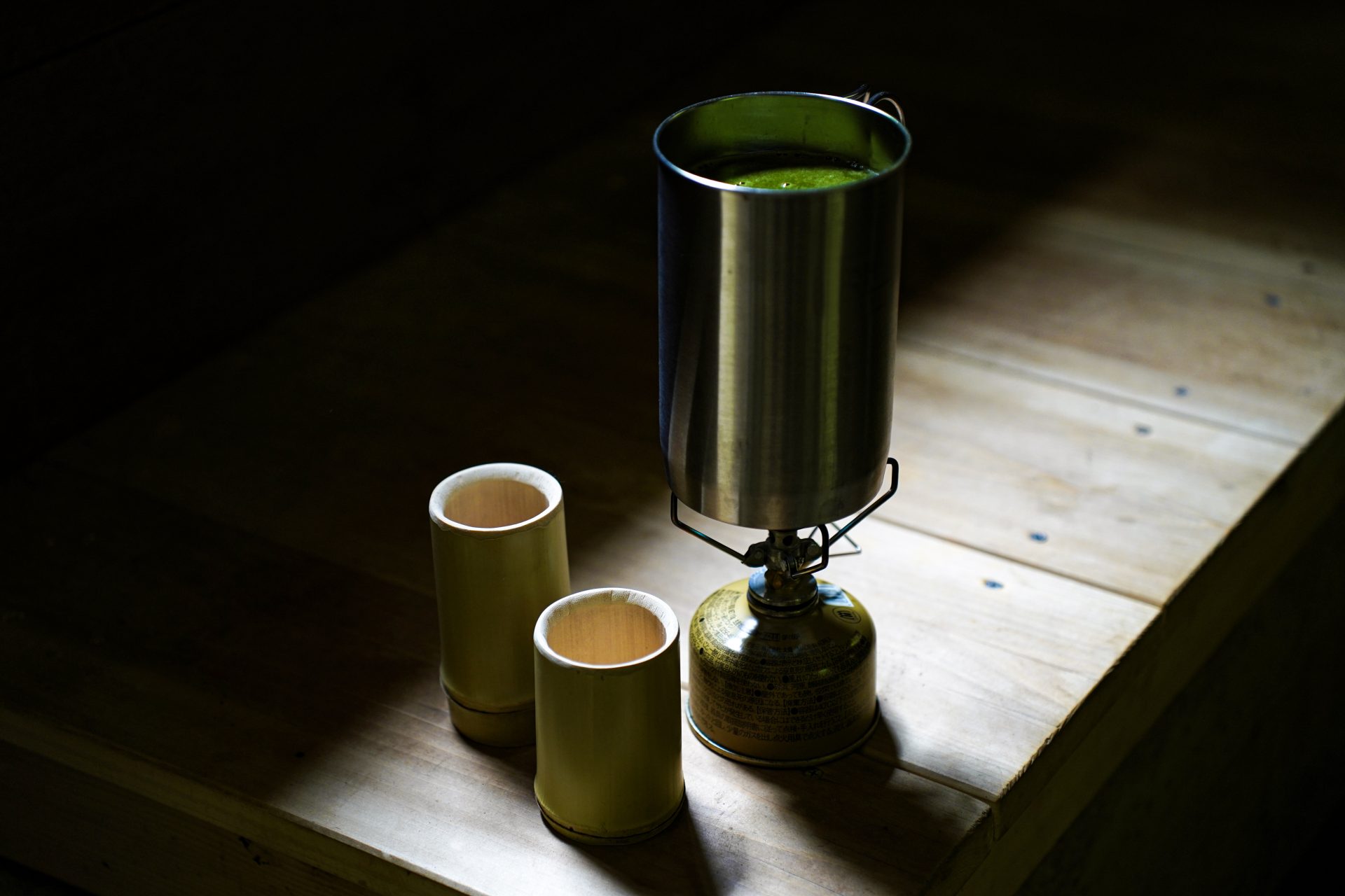 続いて、コース中腹にある休憩所に立ち寄り、Otonamiだけの特別なティータイム。ガイドが淹れる温かい桑の葉茶と、ささやかなお菓子で一息つきます。手づくりの竹製ティーカップは、御岳山と同じ多摩エリアの竹を活用したサステナブルなもの。体験の思い出として持ち帰ることができます。大自然を眺めながらの格別なひとときの後は、本体験もいよいよ終盤。約3時間のハイキングから戻り、最後の鳥居をくぐって聖域から俗世に帰る頃には、心身ともにリフレッシュしたことを感じられるでしょう。