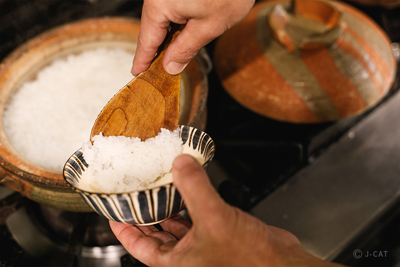お米は先々代の出身地である美山で栽培された「熊彦米」を使用。時代の流れとともに限界集落となり、担い手がいなくなった田畑を手伝うかたちで米作りを始めたのがきっかけだそう。家業のルーツを大切に考える主人の想いから生まれた取り組みで、田植えから刈り入れまでを従業員が担っています。