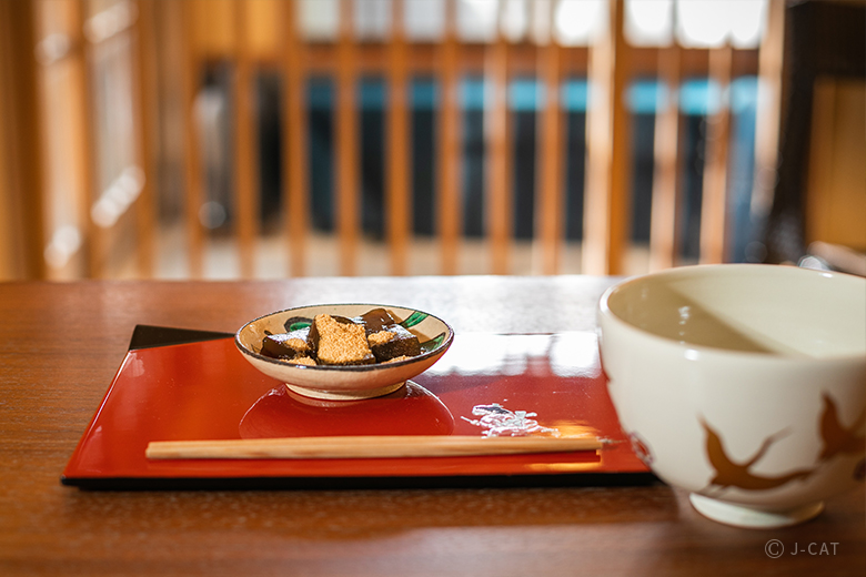 食後には嵐山熊彦特製の甘味をご用意。ぷるんとした食感のわらび餅と、茶釜で沸かしたお湯で淹れた薄茶と一緒にいただきます。薄茶は、本来は濃茶に使われる上質な抹茶を使うという贅沢な逸品。ほのかに甘いわらび餅と濃厚な抹茶との絶妙なハーモニーをお楽しみください。