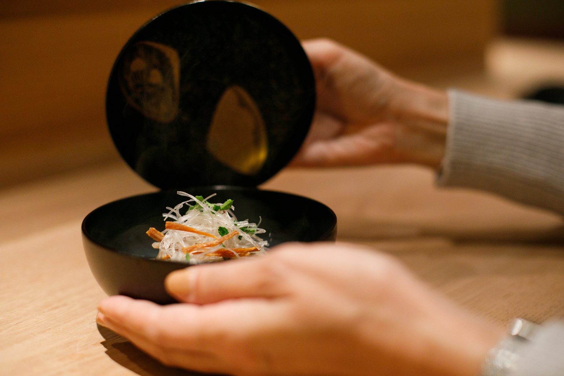 本体験では、カウンター席で主人との会話を楽しみ、食材と食文化を深く学びながら割烹料理を堪能します。昭和初期に、料理人がお客様の目の前で調理をする板前割烹のスタイルを築いたのが、当代の主人の祖父にあたる初代・栗栖熊三郎氏。当時は西陣の旦那衆らが初代と料理を挟んで問答しながら食事を楽しんでいたのだそうです。