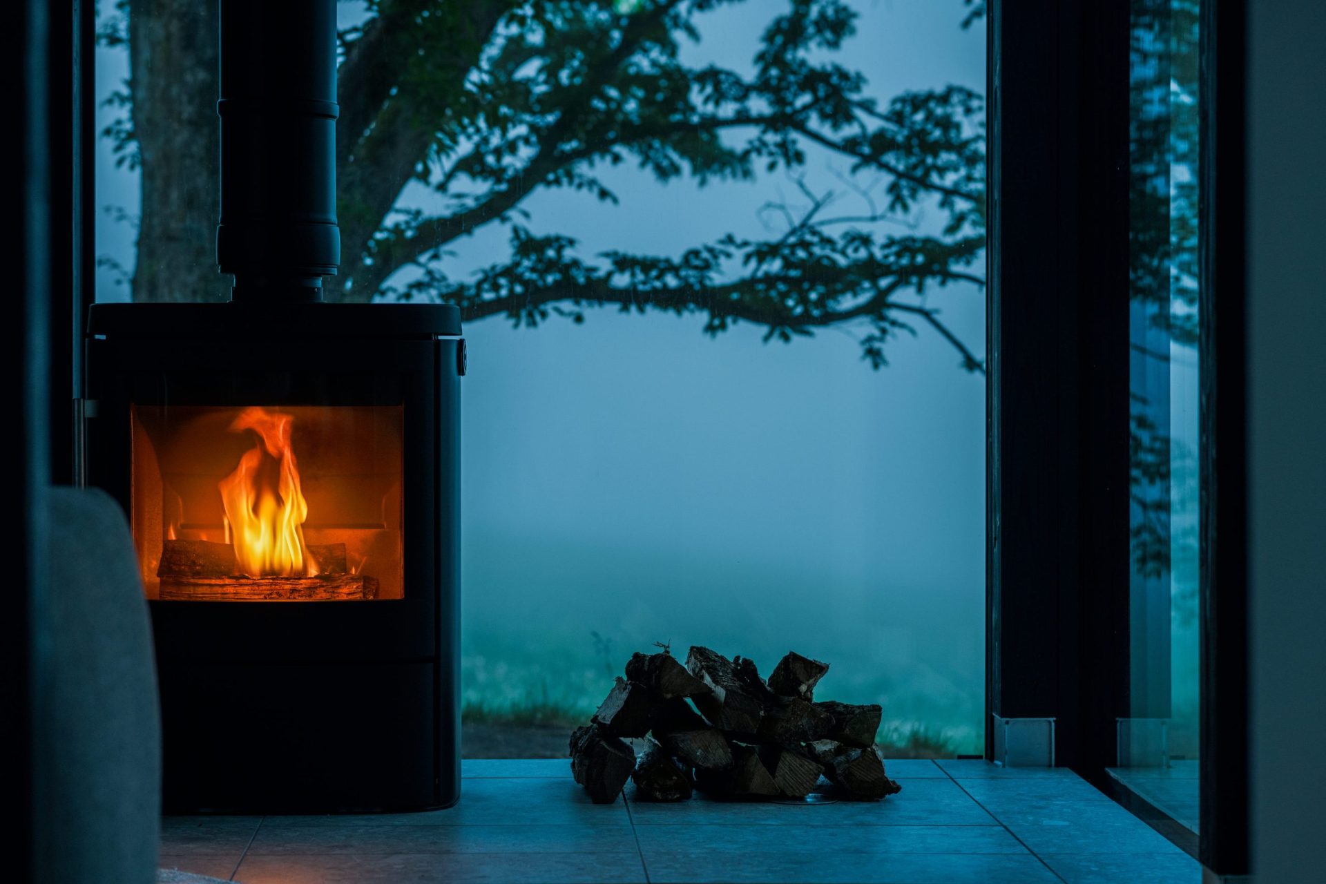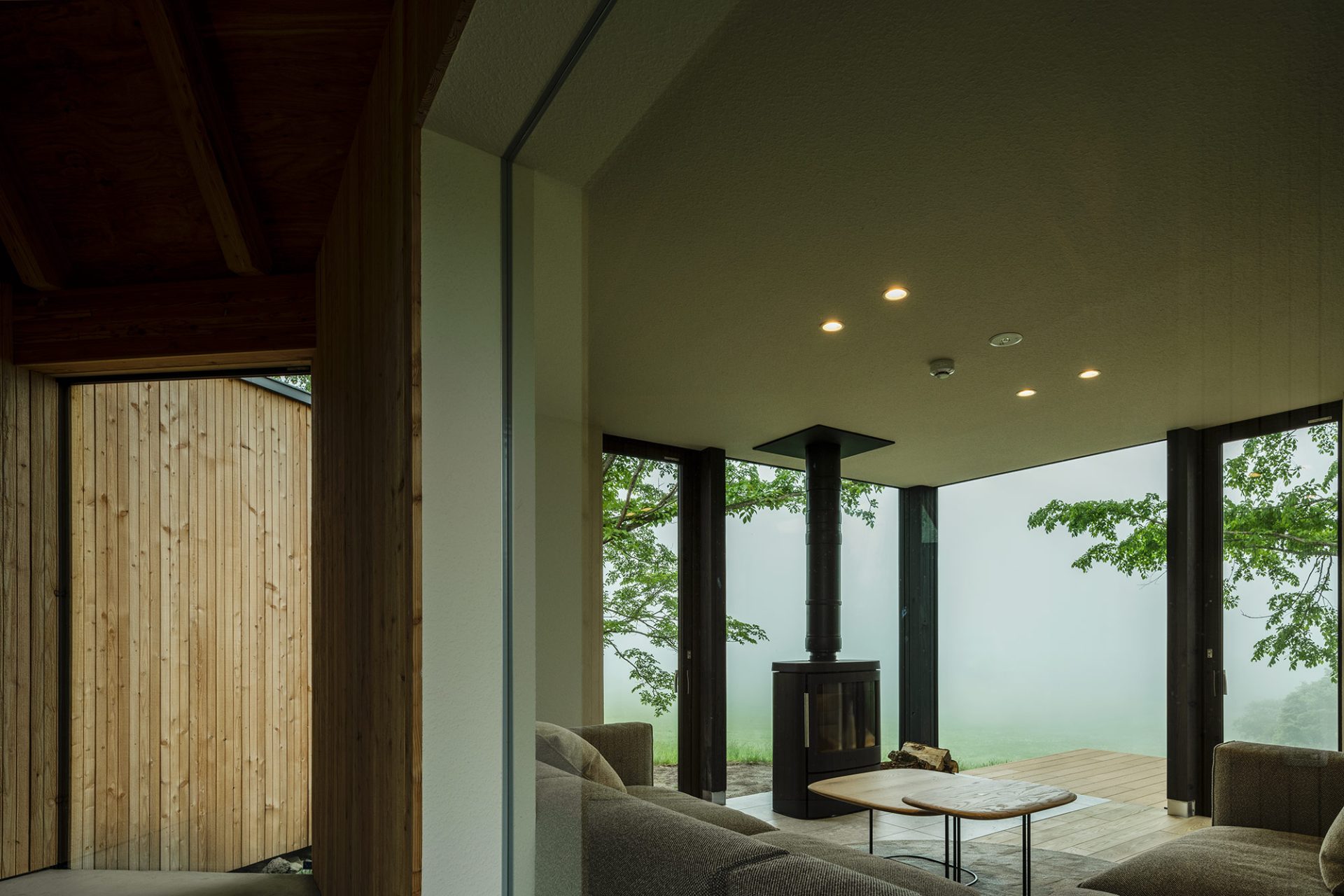 揺らめく薪ストーブの炎と、窓の外に広がる牧草地に囲まれていると、時間がゆっくりと溶けていくようです。