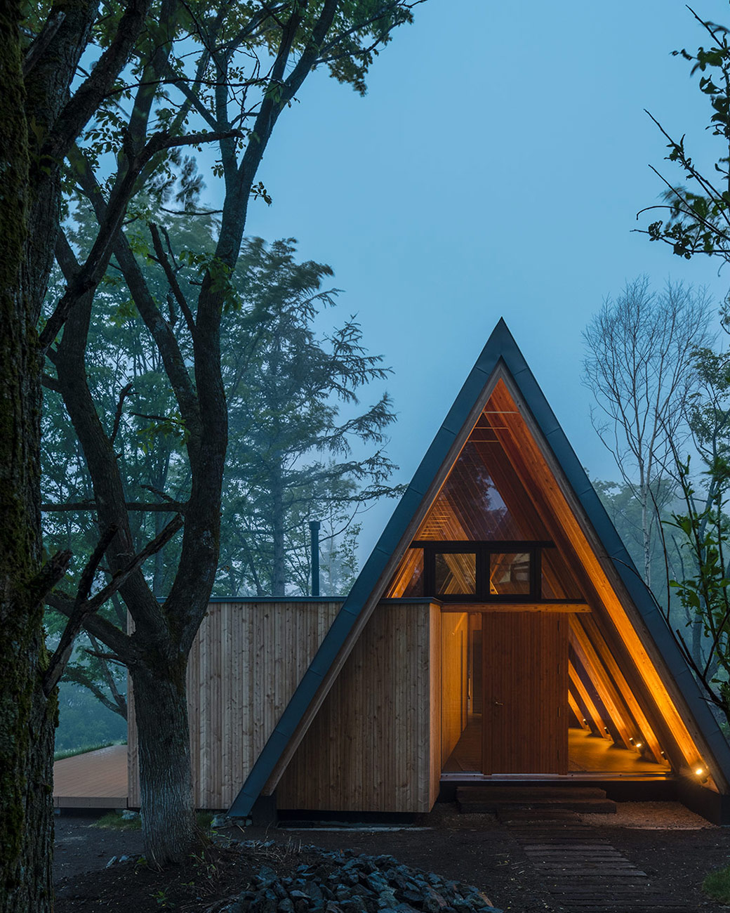 道沿いの木々と調和する三角屋根。森の小道を思わせるデザイン。