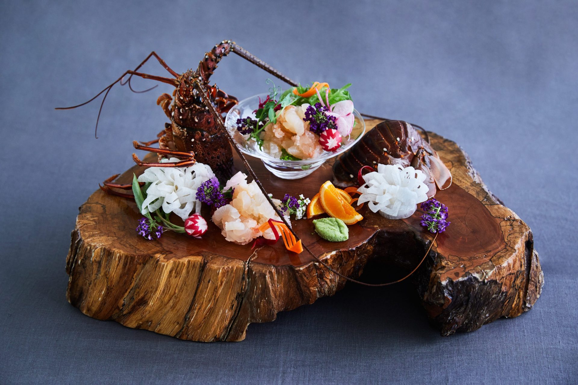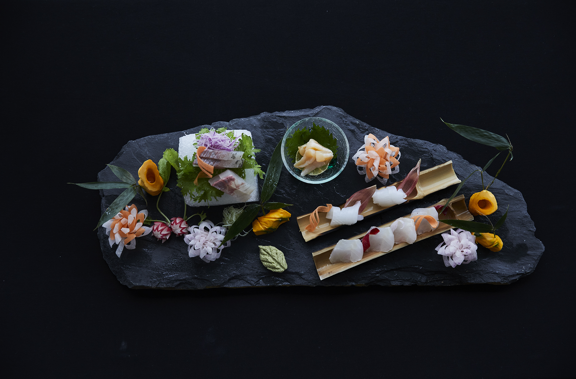 料理長・本城の就任1周年を記念した特別懐石では、愛媛の旬食材を中心に、建築的な美意識と料理人の発想を融合。地元の湧水とまぐろ節で引く出汁を軸に、四季に合わせた3種類の特別懐石をご用意しています。