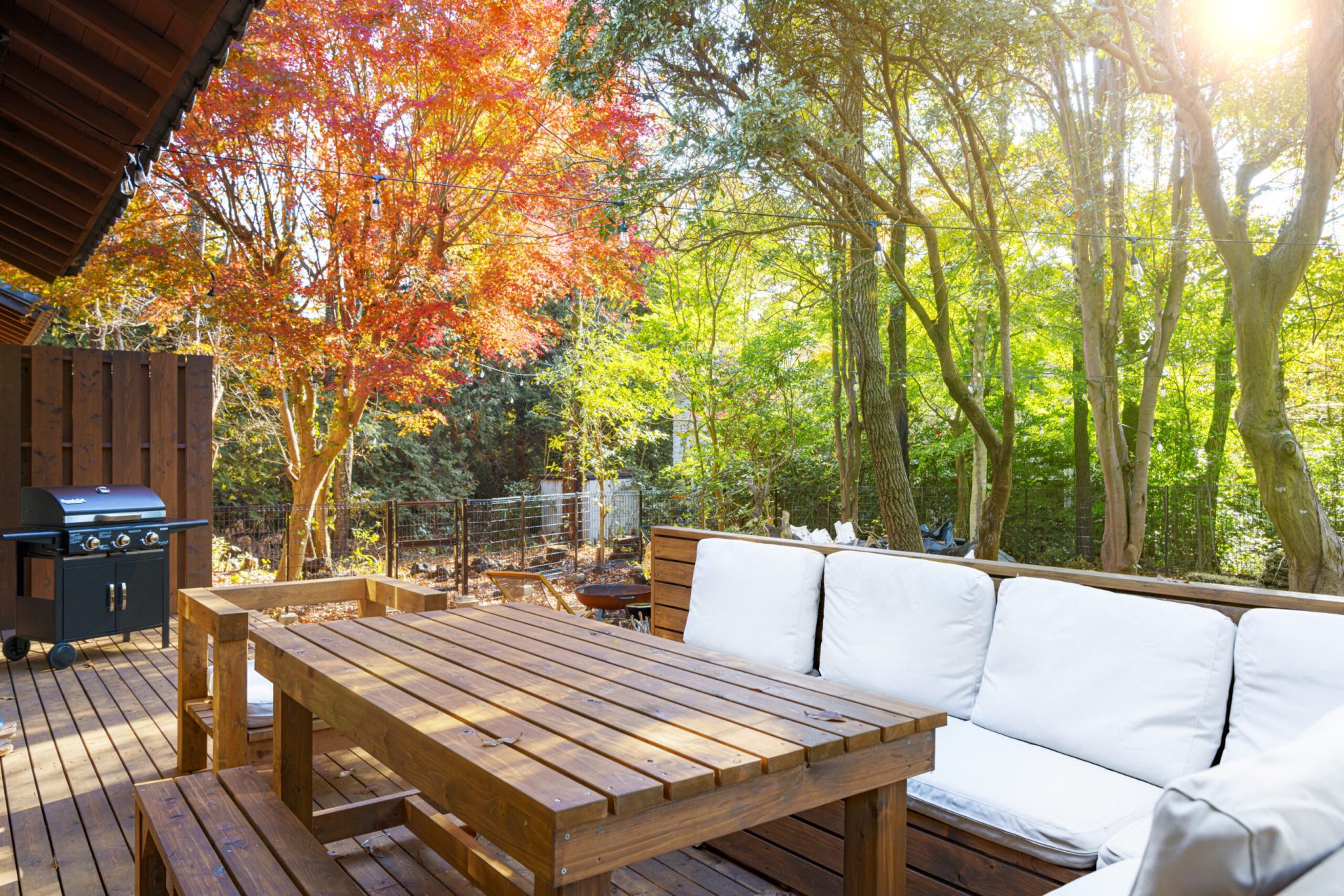 リビングの先に広がるテラスでは、ガスグリルを使ったBBQも可能です。晴れた日は木漏れ日の下で、夜は満天の星と焚火を囲んで。ウッドデッキには屋根もあるため、雨の日でも空と緑を眺めながら過ごすことができます。