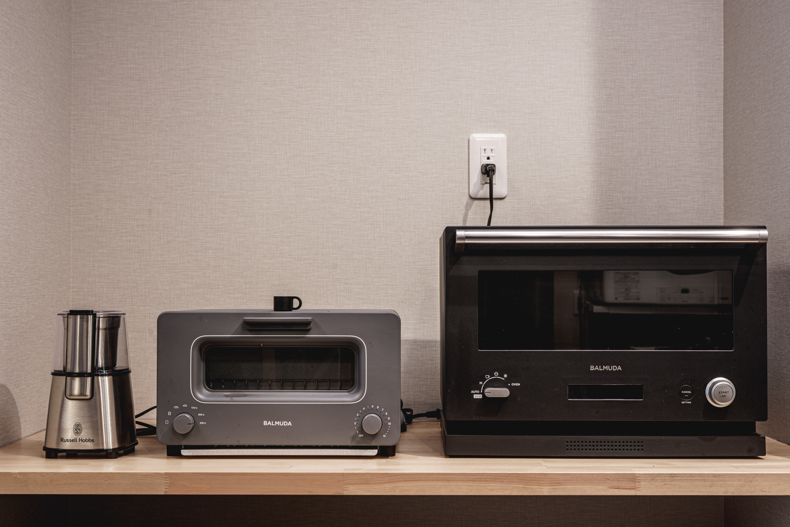 リビングには、8人掛けのダイニングテーブルとふかふかのソファが配され、家族や友人と囲む食卓にも静かな余白が残されます。キッチンにはIHクッキングヒーター、BALMUDA製のオーブンレンジやトースター、基本調味料に至るまで揃い、自炊にもほどよい自由さがあります。