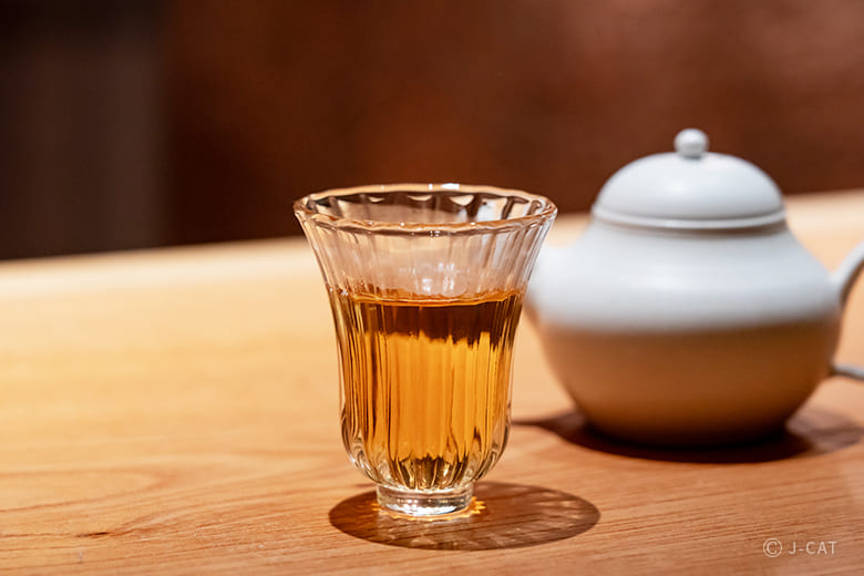 中国茶は、日本のお茶に比べると渋みが少なく、香りが華やかなのが特徴。西岡氏が目の前で淹れる中国茶は、一つひとつの茶葉の個性が立ち、味・香りとともに段階的に変化する様子や、飲み干したあとの茶器の残り香まで感じられます。