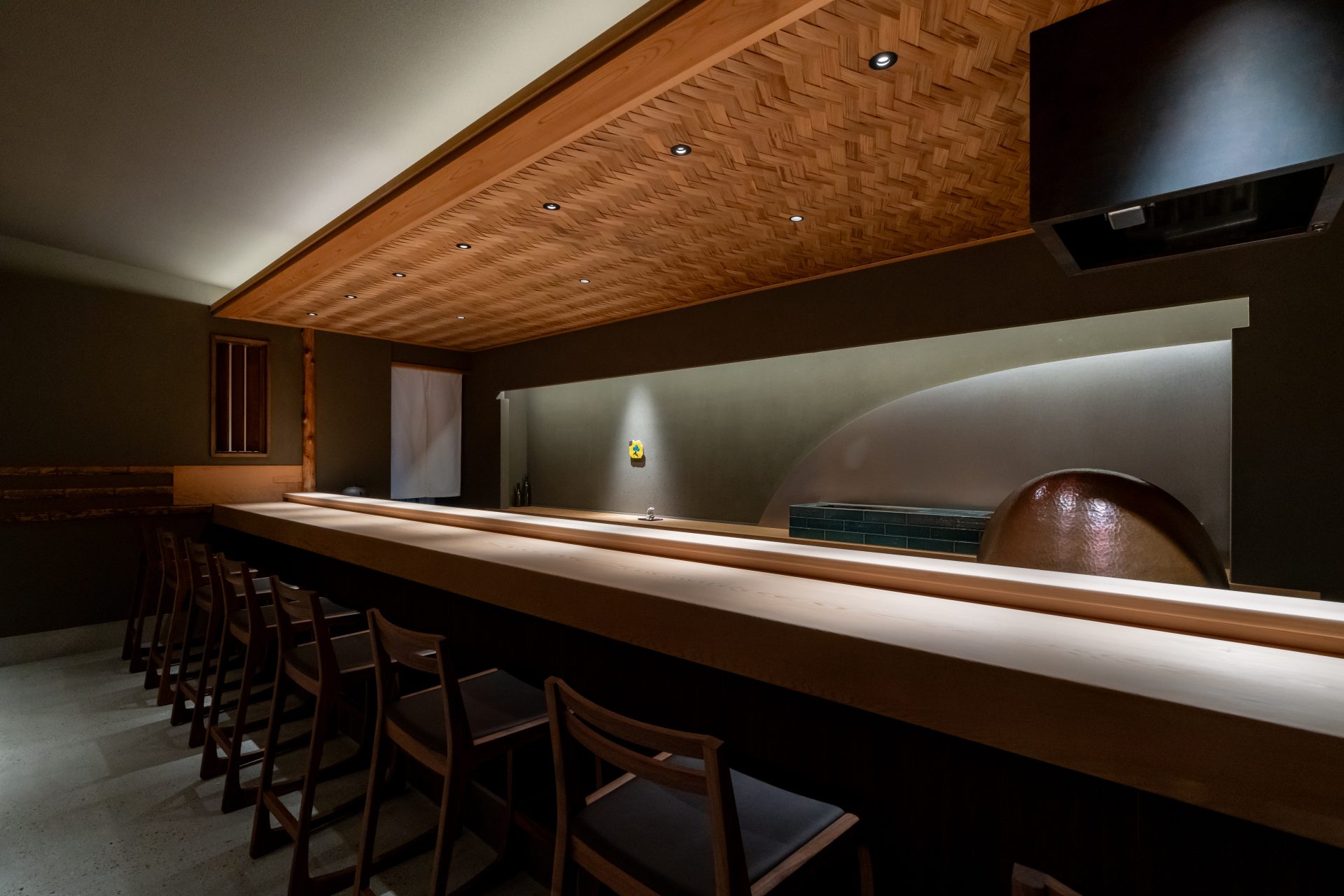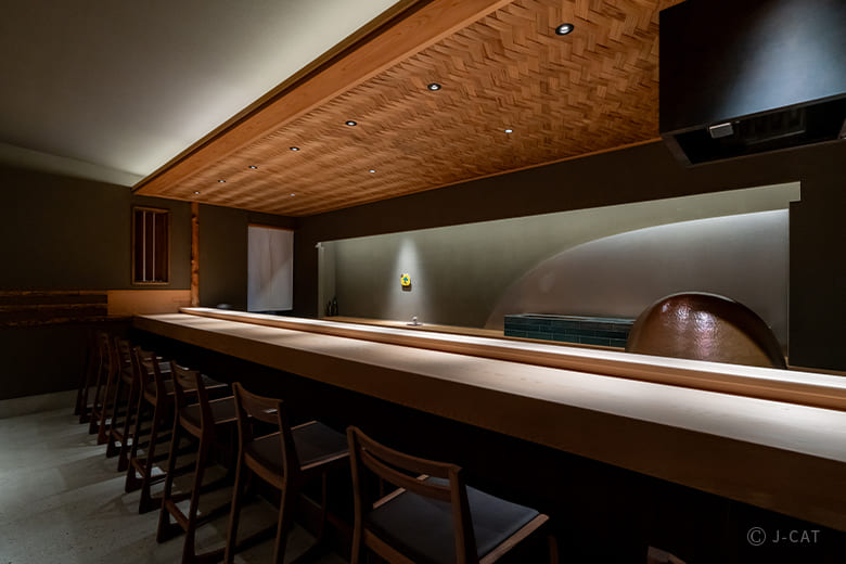 店内には広々としたカウンター席が設けられています。カウンターは先代から受け継いだ樹齢約1300年の檜の一枚板で、木の心地良さを感じます。この場所で西岡氏による丁寧なおもてなしを受けながらゆったりと食事を楽しむことができます。