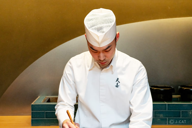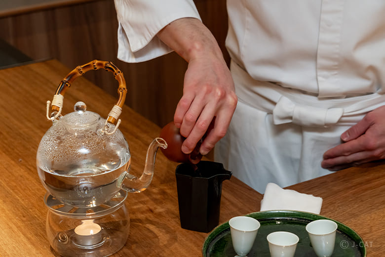2代目としての“自分らしさ”を追求したいと考えた西岡氏は、祖父から受け継いだ天ぷらに合うお茶を探求したいと考え、茶人・堀口一子氏に師事。そこで天ぷらのみならず、日本料理と中国茶の相性の良さを発見してコースに取り入れたところ、多くのお客様に喜んでもらえるようになったそうです。
