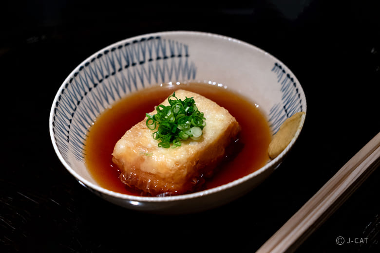 ▲豆腐の天ぷらには、北野天満宮前の「とようけ屋 山本」の絹どうふを使用