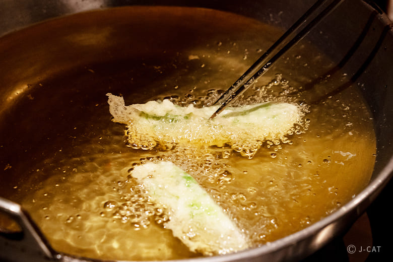 ▲西岡氏がその季節に最もおいしいと厳選した素材を揚げる