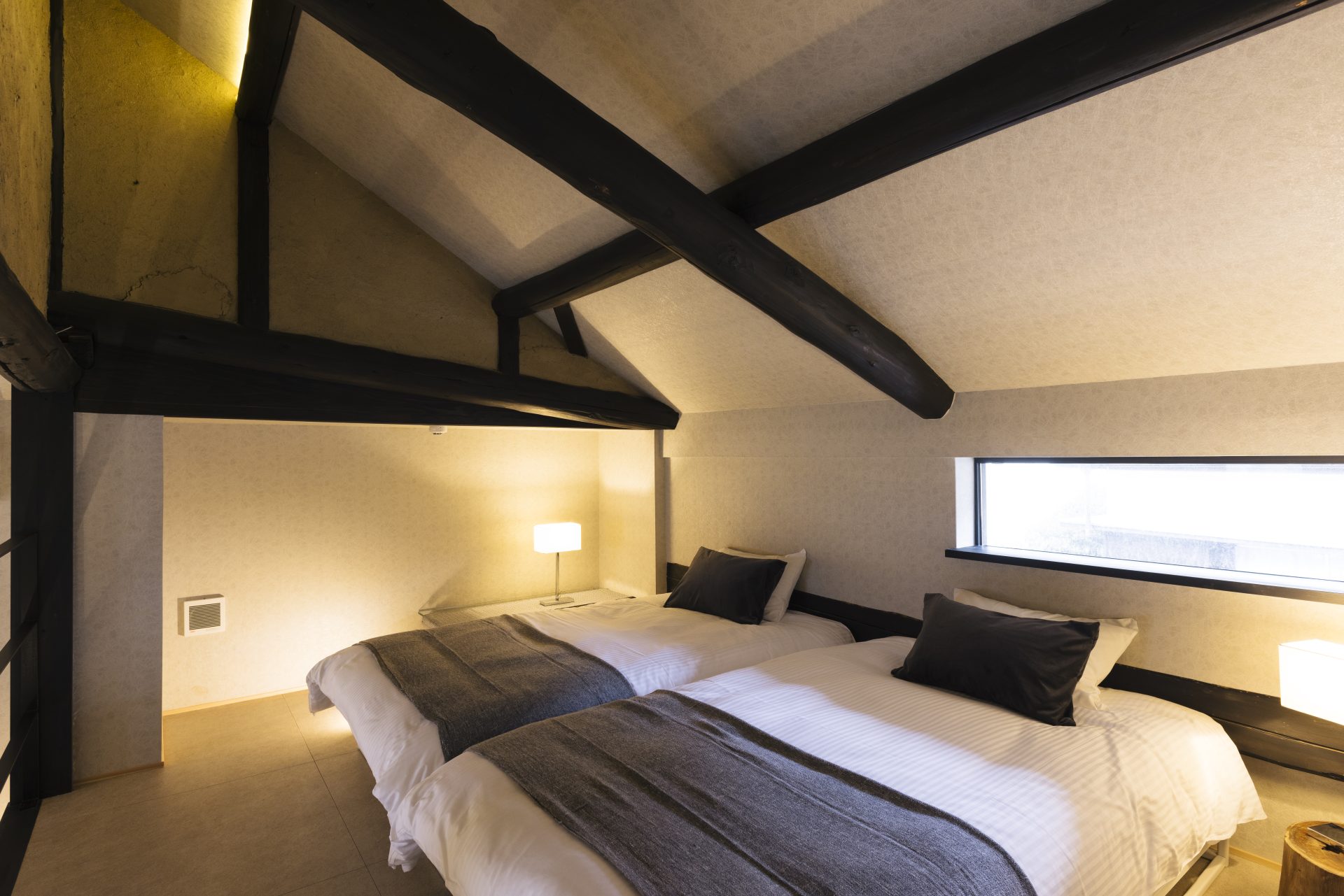 築130年の風情ある梁を残し、開放的な吹き抜け空間が最上の癒しをお届けします。木の温もりとモダンさが融合した、暮らすように泊まれるスイートルームです。ベッドルームをロフトスペースにご用意し、空間を贅沢にご利用いただけます。