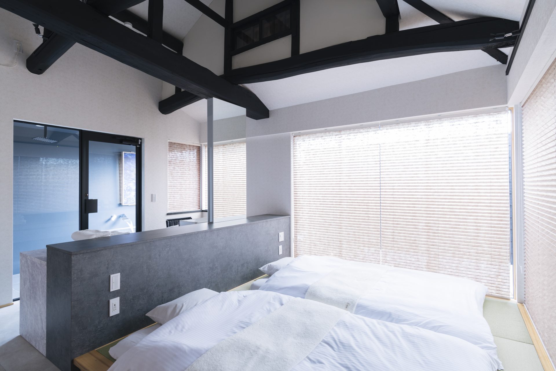WellisVillaAwajiで唯一の和室のお部屋は、美しい自然光とゆとりを生む天井高が特徴。