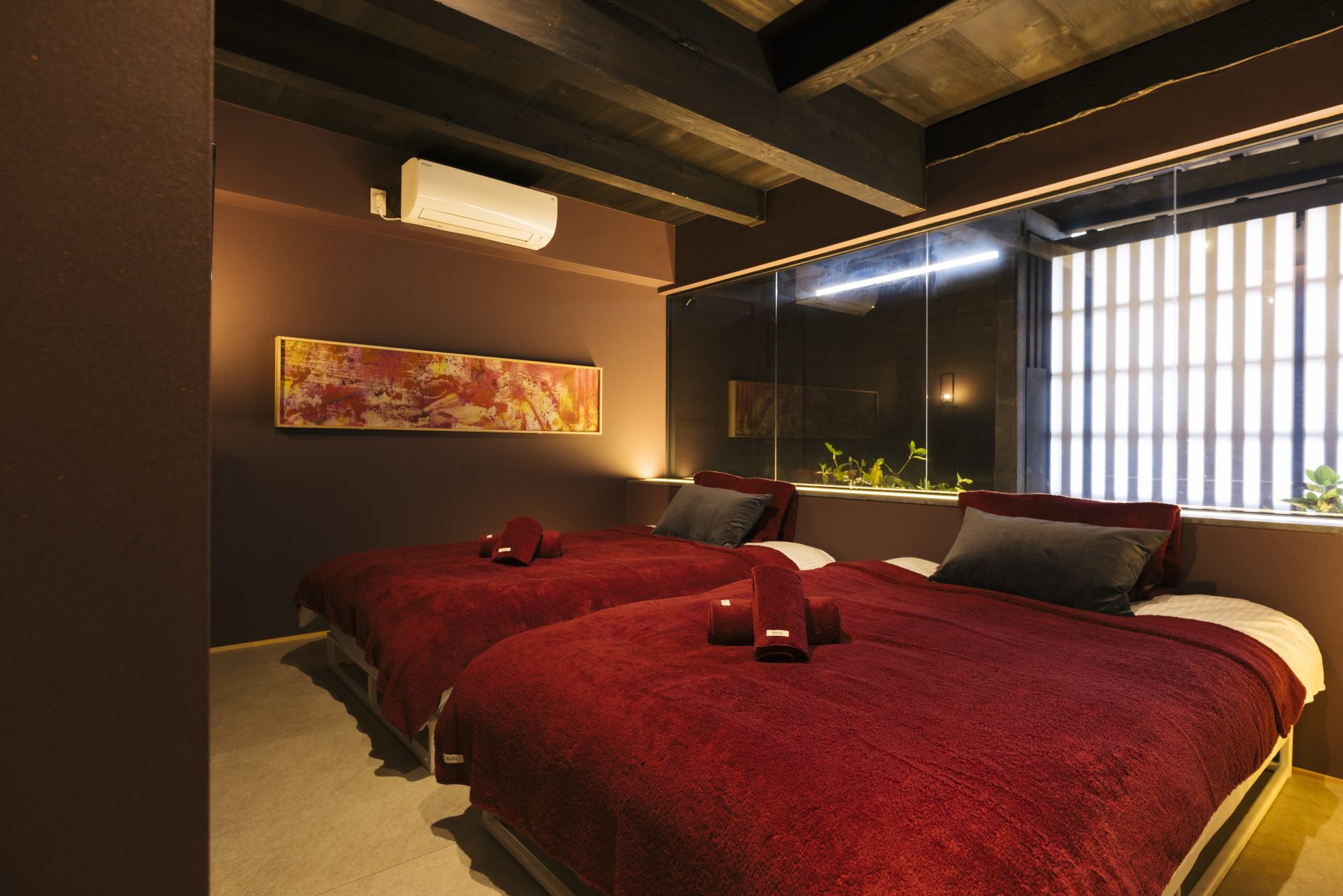 明治時代の建築物が持つ重厚感はそのままに、大人のための寛ぎを追求した上質な空間。ボルドーカラーの壁に優しく差し込む自然光が、心地良い朝の目覚めを約束します。室内に廊下を設けてプライベート感を重視しました。