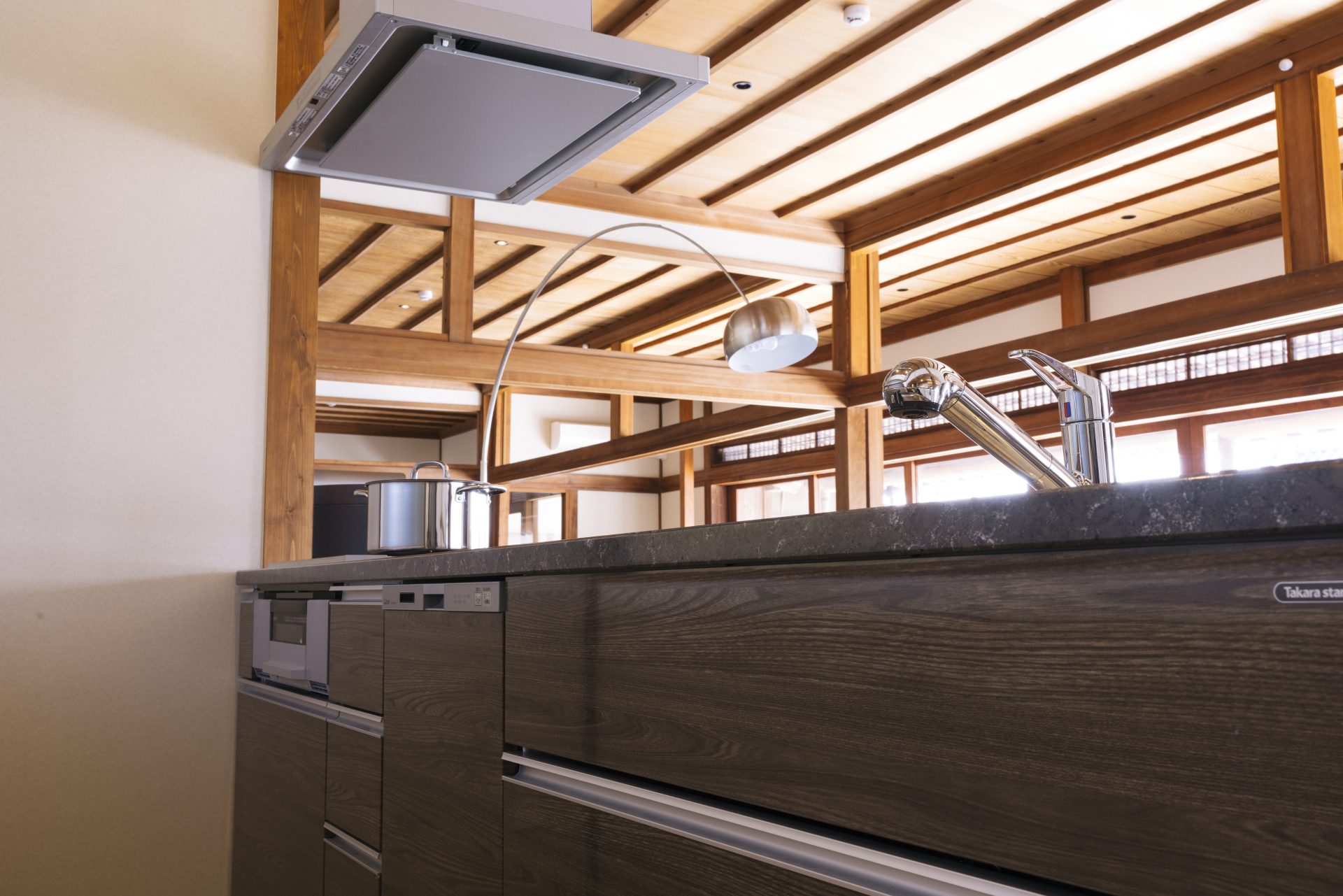 重厚な梁や坪庭といった日本の風情を感じる空間を、シック&モダンにアップデート。スタイリッシュなしつらえが、ホテルライクな雰囲気です。