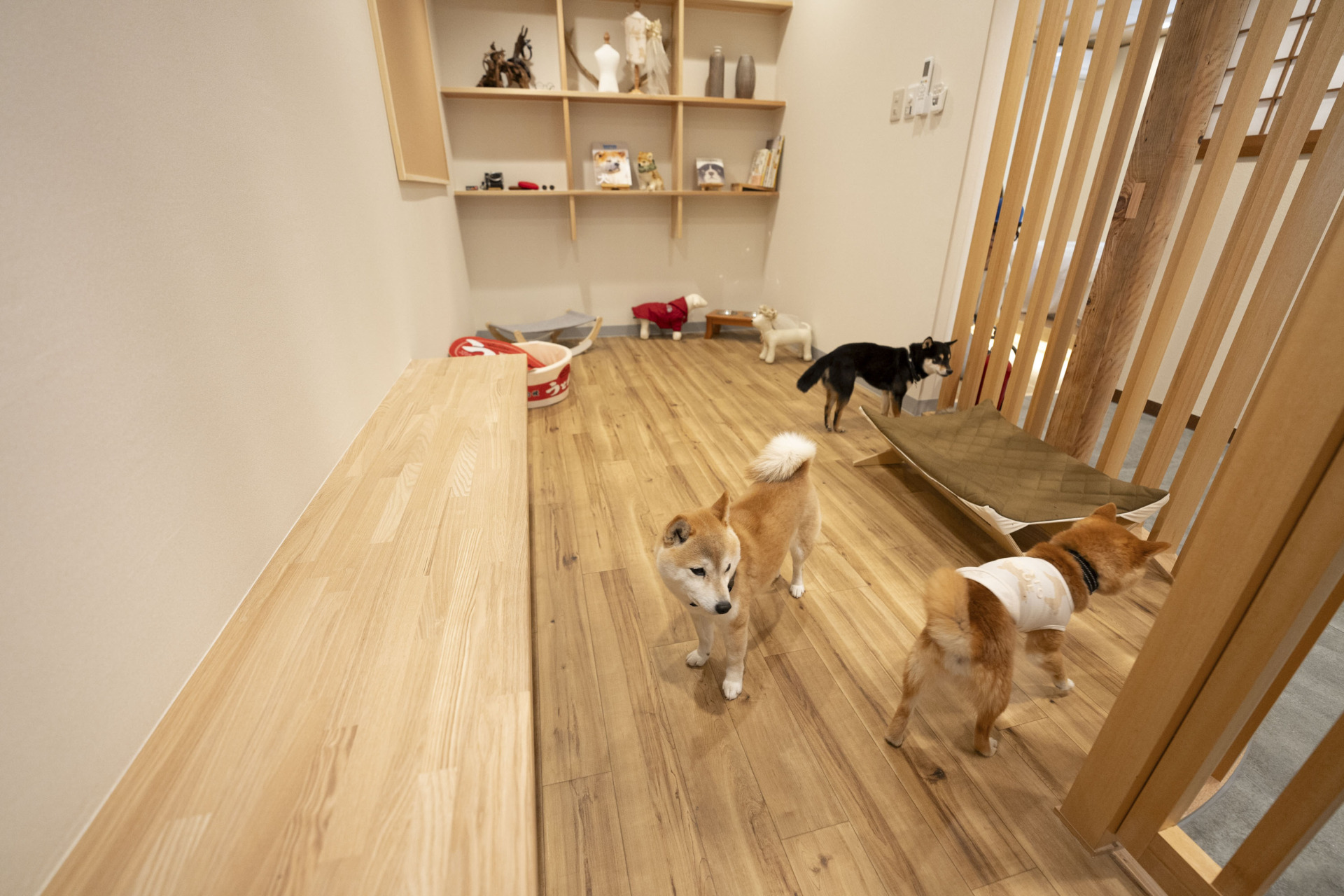 木々の気配が身近に感じられる環境の中で、人と犬が同じ空間でゆったりと過ごせる場所。
