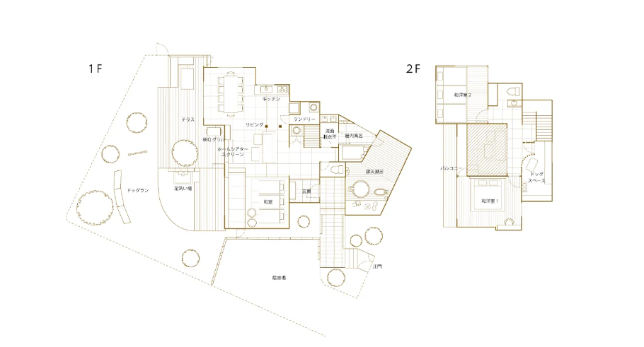 建物の外には広い庭とテラスが広がっています。木々に囲まれた環境の中で、外の空気を感じながら過ごす時間。愛犬が庭を歩き回る様子を眺めながら、ゆったりとしたひとときが流れます。
