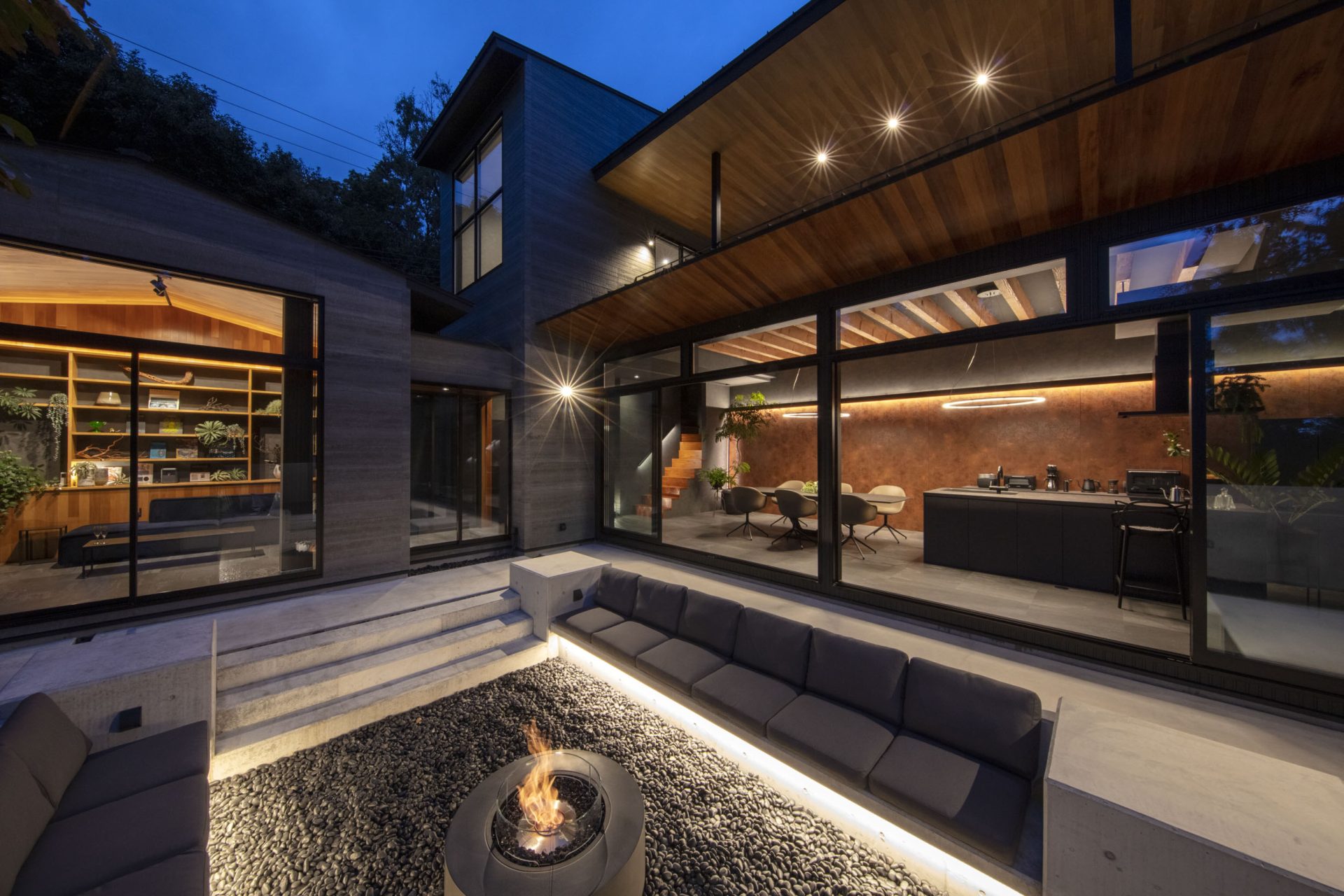 室内から緩やかにつながるアウトドアリビングでは、エタノール暖炉や海外製のガスグリルを使ったBBQも可能。