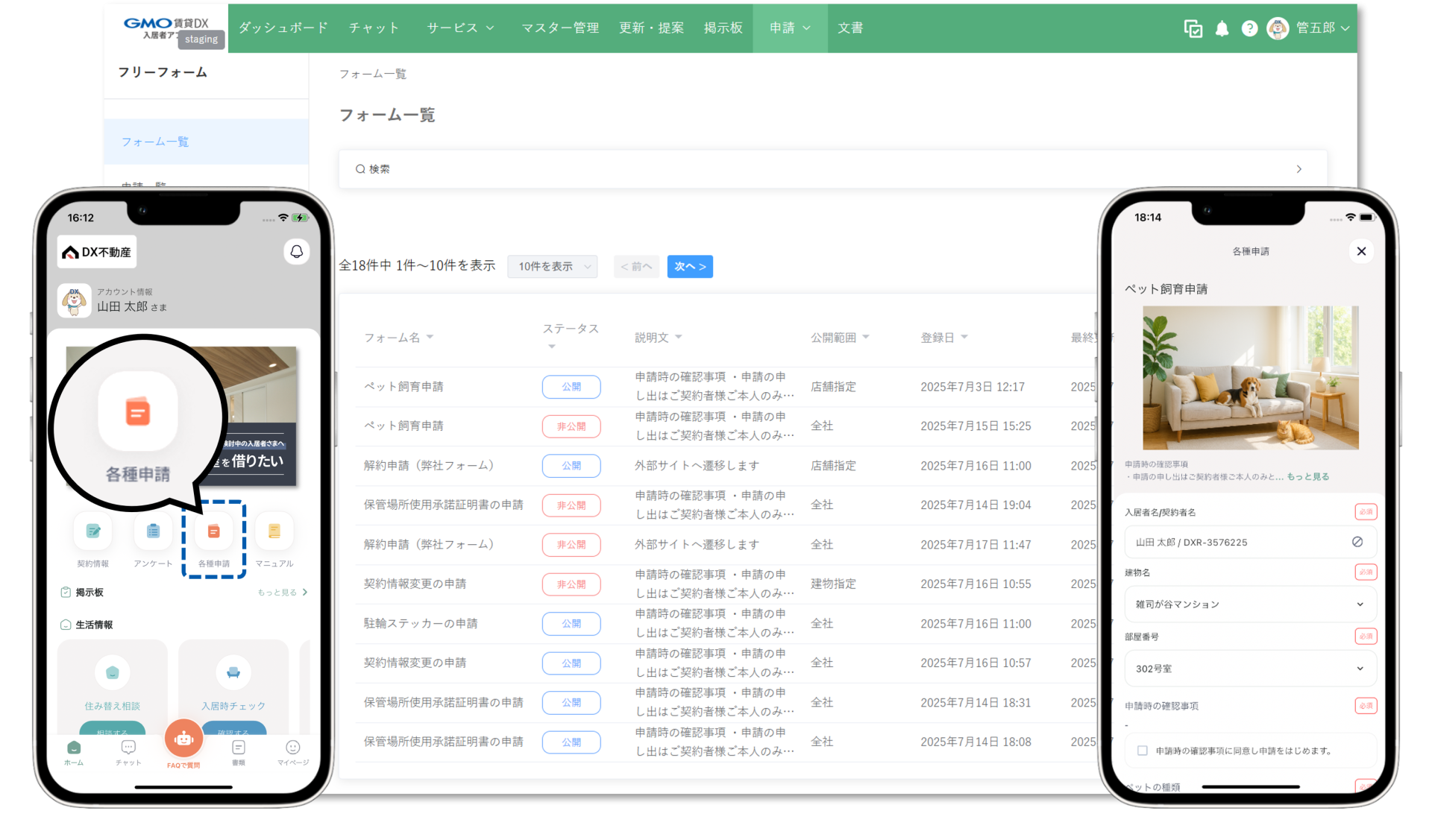 管理会社様は、「車庫証明の発行申請」や「ペット飼育の申請」など、各種申請受付用のフォームを自由に作成できます。